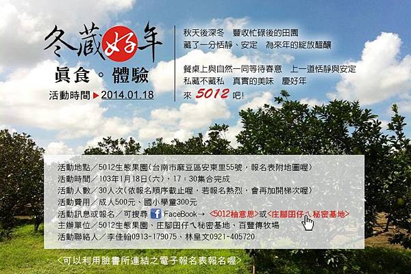 ★活動地點:5012生態果園(台南市麻豆區安東里55號,報名表附地圖喔)
