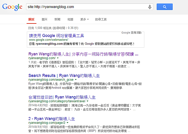 原則上來說,如果網站成立了一個月之後,在搜尋引擎上連一點痕跡都無法找到,通常可能會是因為第一、二種狀況;第三種狀況則頂多只是讓你的網站比較慢被收錄罷了,你就耐心等等吧...............;至於第四種情形,則通常會發生搜尋引擎只收錄了你的首頁,其他文章則完全沒被收錄或是很少收錄的情況,那可能就代表了你的網站架構並不利於搜尋引擎收錄你的文章。至於該如何得知你的網站目前究竟有多少內容已被搜尋引擎所收錄,以Google搜尋引擎來說,可以透過一種方法來檢視,你可以在Google搜尋欄位上輸入「site:你的網址」,如下圖所示,就可以知道網站的收錄狀況: