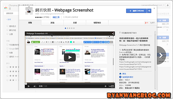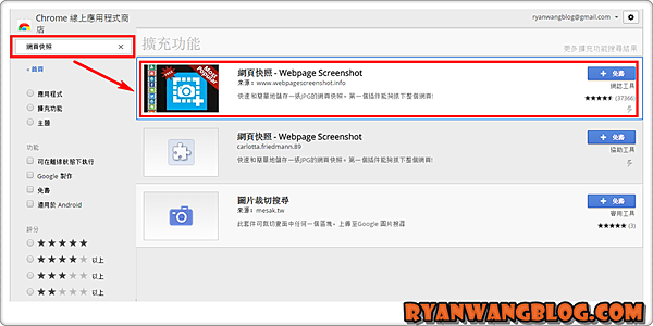 在Google Chrome線上應用程式商店的搜尋框內輸入"網頁快照",找到"網頁快照 - Webpage Screenshot"這個擴充功能,然後就立即下載安裝吧~~