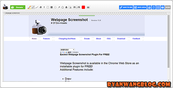 或許"網頁快照 - Webpage Screenshot"有些功能跟你常使用的截圖工具類似,但差別在於截圖之後,你不用回到小畫家去做圖片修飾,而是在你擷取畫面之後,頁面會自動跳到編輯畫面之中,相當方便: