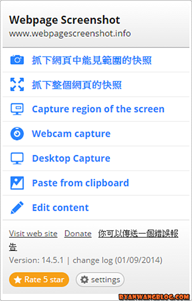 點選進入操作畫面之後,可以看到"網頁快照 - Webpage Screenshot"提供了許多不同截圖功能,以下分別就幾個實用功能為大家簡單做介紹: