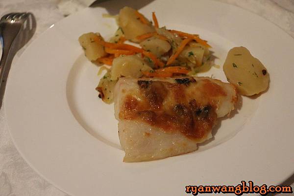 接下來是主菜的部分,和亞洲人以米飯或麵食為主食不同,俄羅斯餐主要是以馬鈴薯為主(大多都是馬鈴薯泥),然後搭配上一份肉類,圖片中主要是馬鈴薯搭配上厚實、多汁又稍微有些嚼勁的煎魚排,俄羅斯餐廳的調味普遍適中,不會太鹹或太淡,非常容易接受,看似簡單的料理方式,卻非常好吃~~