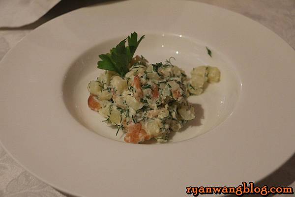 首先是前菜的部分,馬鈴薯丁加上醃鮭魚沙拉,吃起來不僅清爽又開胃~~