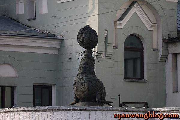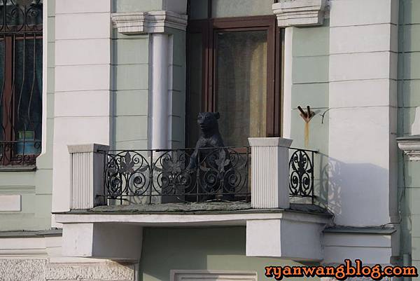 這棟建築物也非常有趣,前方除了有一個顯眼的海豹雕像之外,二樓陽台上還有一頭看似凶猛、威嚴的黑熊鎮守在這~~
